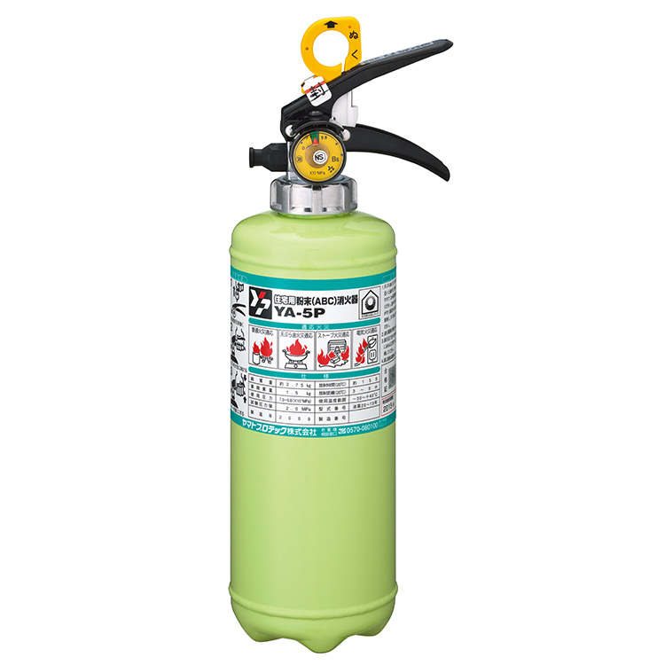 住宅用粉末(ABC)蓄圧式一覧 住宅用粉末(ABC)消火器 YA-3PNX 薬剤量:1.0kg 型式番号:消第30~11号 住宅用粉末(ABC)消火器 YA-4PNX 薬剤量:1.2kg 型式番号:消第30~12号(塩ビホース) 住宅用粉末(ABC)消火器 YA-5PNX 薬剤量:1.5kg 型式番号:消第30~14号 住宅用粉末(ABC)消火器 YA-6PNX 薬剤量:2.0kg 型式番号:消第30~15号(塩ビホース)