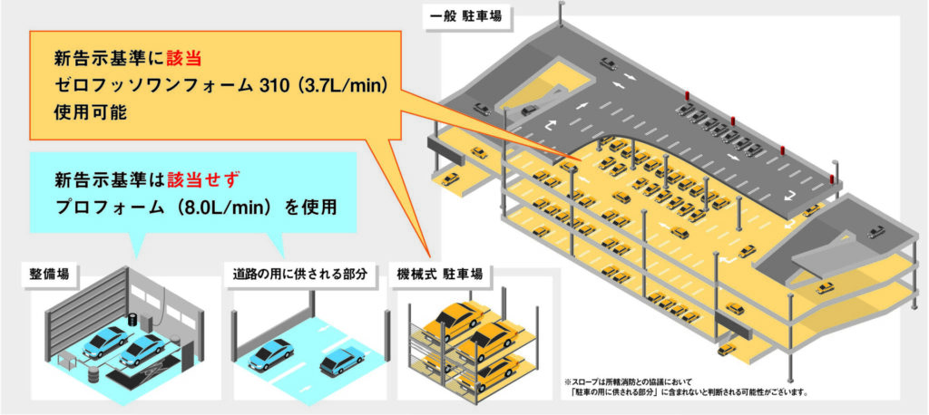 本改正により、「駐車の用に供される部分」については、使用する薬剤の種類にかかわらず、水成膜泡消火薬剤と同等の放射量での使用が可能となりました。